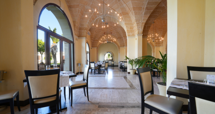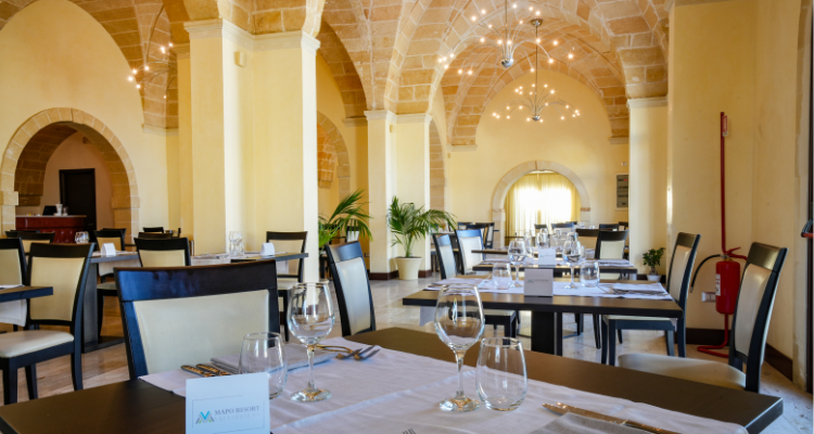 Ristorante con servizio al tavolo con scelta tra due primi e due secondi di carne e pesce, buffet di antipasti e insalate, frutta e dolci. Ricca colazione servita nella sala interna, con prodotti salentini e internazionale.